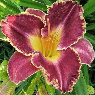 Рассада лилейника Сторм оф зе Сенчури (Storm of the Century) привлекает к себе всеобщее внимание и навсегда остается в сердце своего обладателя. Такой бесподобный цветок украсит собой любой палисадник или клумбу, и он не должен быть скрытым от посторонних глаз, пусть наслаждаются все. Лепестки имеет пурпурно-фиолетовый оттенок, сильно гофрированные края – сливовые, и такого же оттенка глазок. При этом его горло светящегося желто-зеленого цвета с белыми радиальными лучами. Средняя высота взрослого растения около 55 см, а цветы в диаметре достигают 15 см. Семена лилейника Сторм оф зе Сенчури (Storm of the Century) могут собираться и храниться для проращивания.