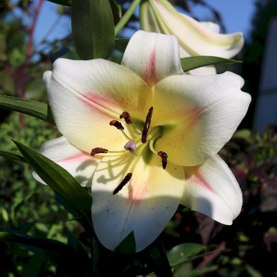 • Окраска цветка : белый с желтоватым центром, со светло-малиновыми продольными мазками по центру лепестков и темными пыльниками