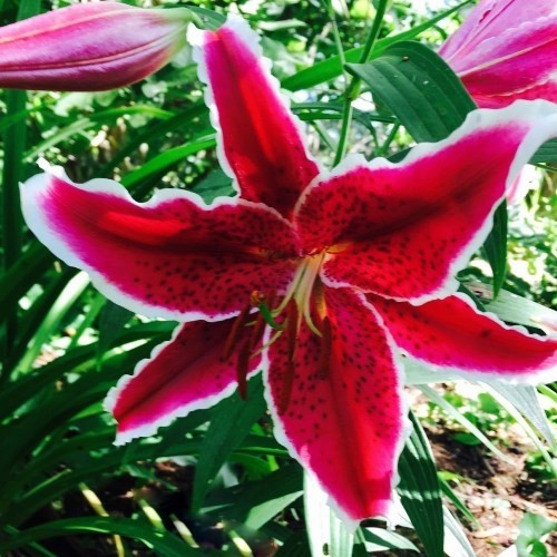 Окраска цветка : ярко-малиновый с темным крапом и белой каймой по краям