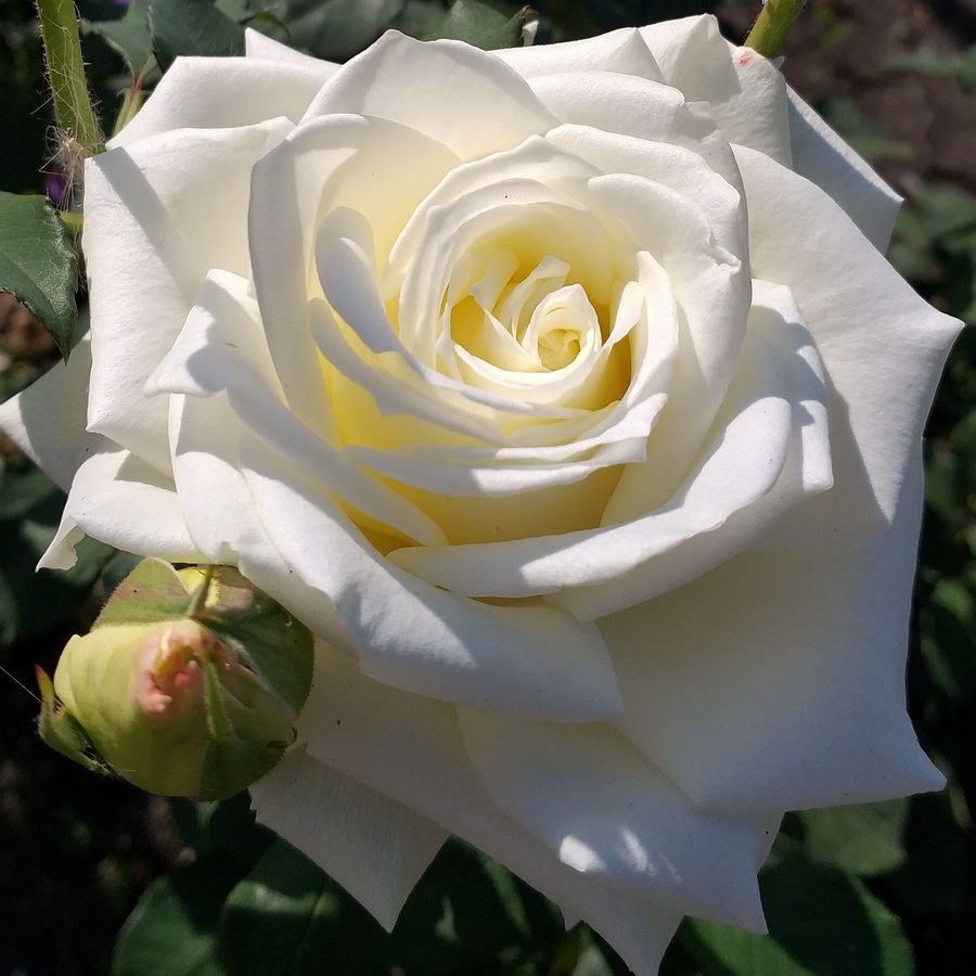Цветок: чисто белый до голубоватого, чашевидный, с высоким центром, махровый, 20 - 30 лепестков в одном цветке. .Цветки красиво сочетаются с темно-зелеными крупными листьями. Роза может использоваться на срез, долго сохраняет свежесть в букете. Зимостойкость средняя, на зиму требует укрытия.