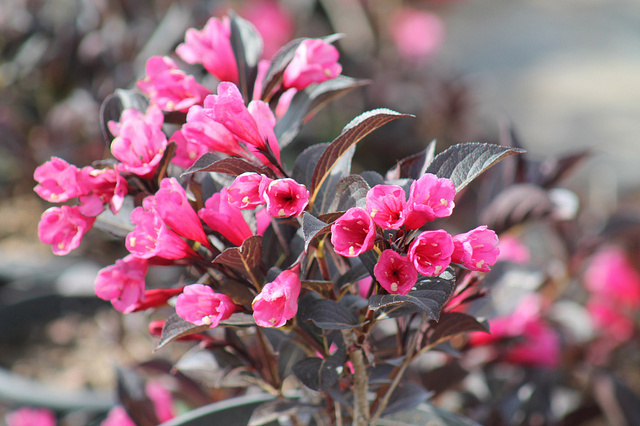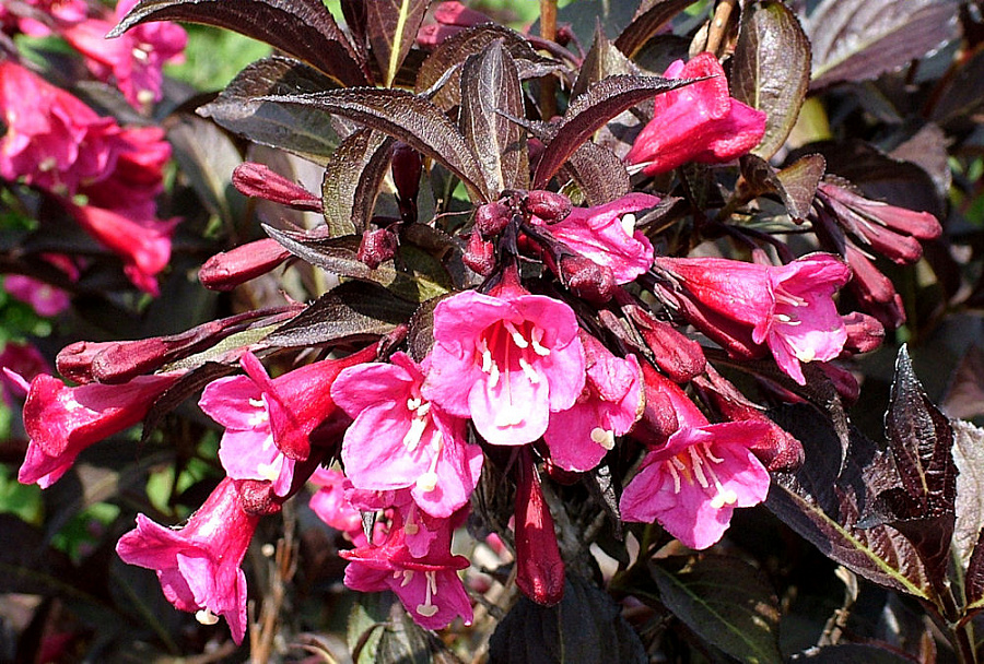 Саженцы вейгелы цветущей Александра (Alexandra) подарят саду декоративный лиственный кустарник с густой кроной шаровидной формы. Сорт очень популярен благодаря сочетанию ярких красно-розовых воронковидных цветочков с бордовой листвой. Обильное цветение приходится на июль, но в меньшем количестве привлекательные цветки могут появляться до сентября.