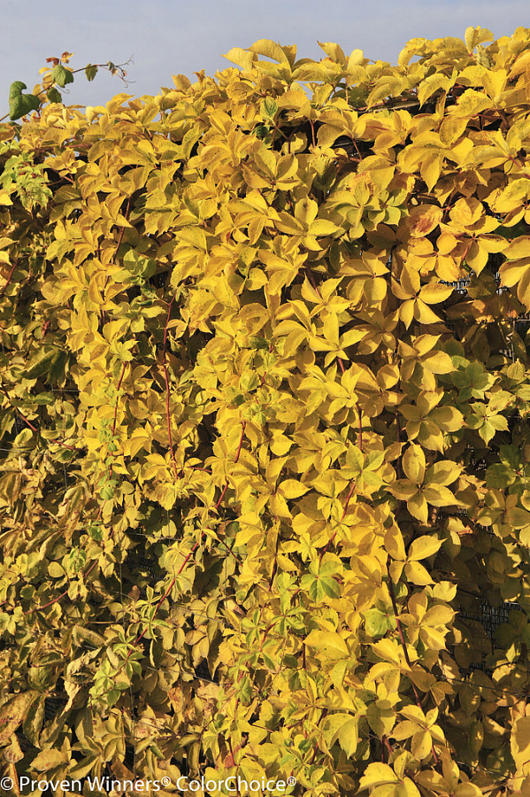 Саженцы Винограда девичьего пятилисточкового Еллоу Уолл (Yellow Wall) осенью «озолотят» ваше подворье ярко-жёлтым окрасом листьев. Устойчив к зиме, а в жаркую погоду любит умеренный полив. Растёт быстро, достигая 14м в длину. Чередуя Yellow Wall с другими сортами, к осени можно получить потрясающую палитру красок. Как любая лиана, требует хорошей опоры (пергола, беседка, стена) для стремительного роста побегов. Цветёт в конце мая малозаметными белыми цветками. Тёмно-синие плоды можно получить уже в сентябре первого года, если высадить сразу крупномер Yellow Wall.